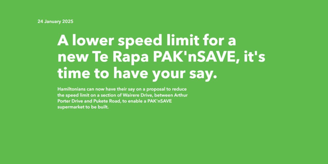 The public consultation for lowering the speed limit on Hamilton’s Wairere Drive closes on 7 March 2025. The following information has been copied from the Hamilton City Council webpage… https://hamilton.govt.nz/your-council/news/on-the-move/lower-speed-or-a-new-supermarket-public-to-have-their-say-1 “ Hamiltonians can now have their say on a proposal to reduce the speed limit on a section of Wairere Drive, between … Continue reading Consultation Closes 7 March 2025: Lowering Speed Limit on Wairere Drive, Hamilton