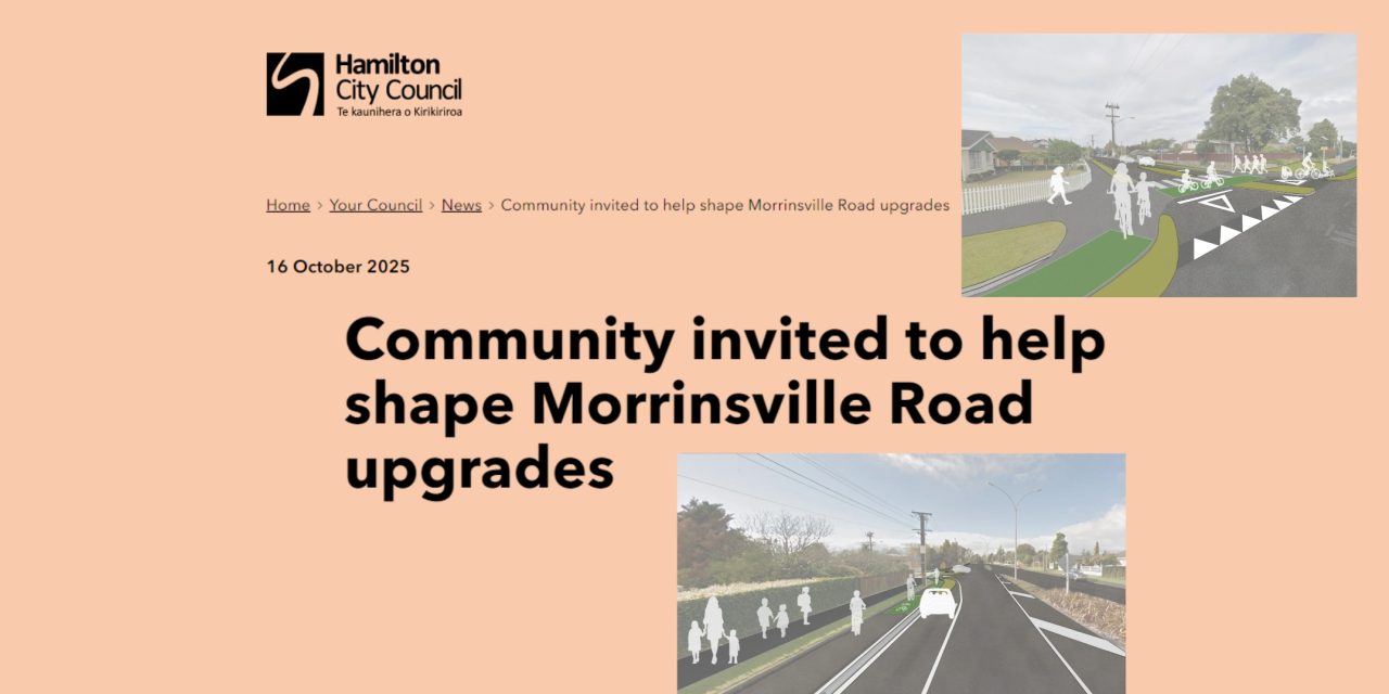 The public consultation for the proposed Morrinsville Road upgrades closes on 9 November 2025. The following information has been copied from the Hamilton City Council webpage… https://hamilton.govt.nz/your-council/news/on-the-move/community-invited-to-help-shape-morrinsville-road-upgrades “A community thrives when its streets are safe for everyone, especially children. When young people can walk, bike, or scooter to school with confidence and ease, it … Continue reading Consultation Closes 9 November 2025: Morrinsville Road upgrades, Hamilton