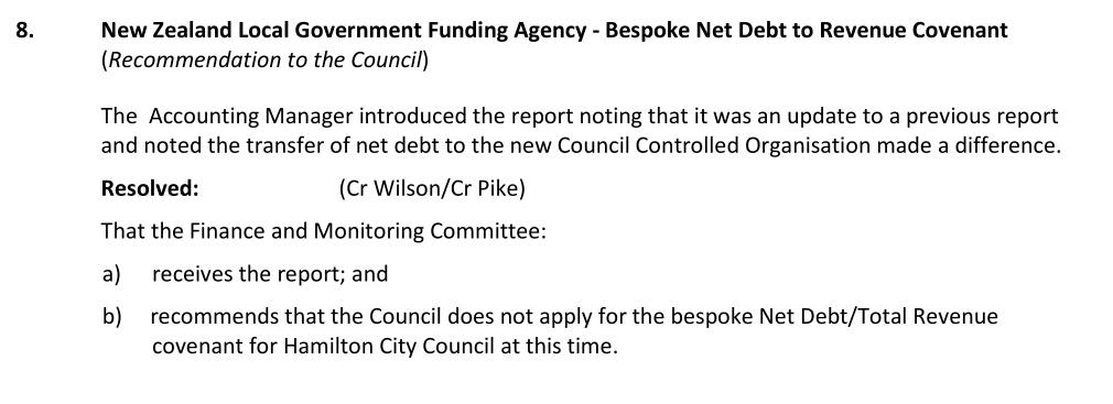 - On the 24th of June 2025, Hamilton’s Finance and Monitoring Committee voted unanimously to support the staff recommendation not to apply for an increase to their debt limit with the LGFA.