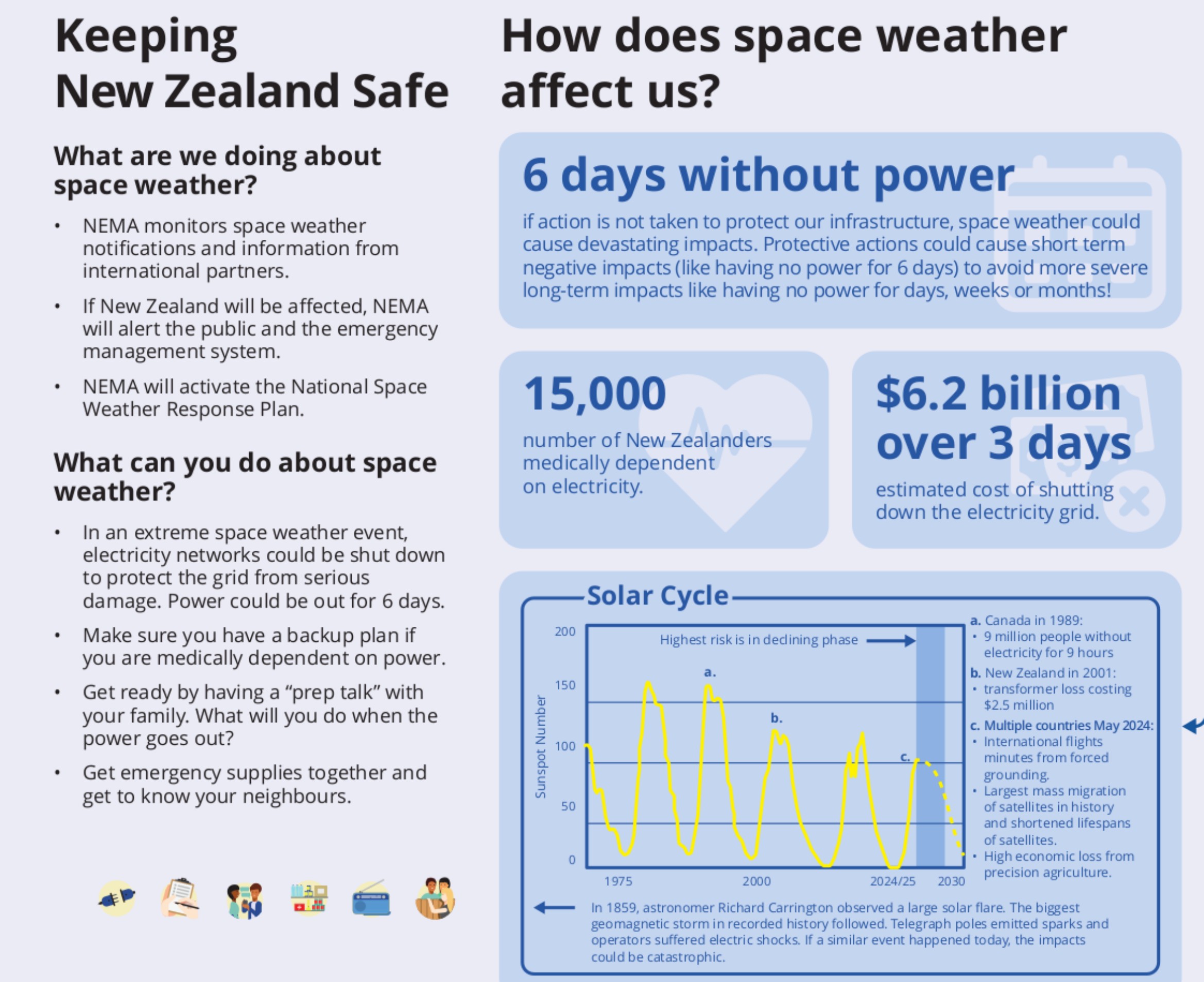 A space weather hazard poster from NEMA predicts a 30% chance of an “extreme” space weather event in terms of “likelihood in the next 50 years”. This likelihood was 6 times higher than a magnitude 7.5 earthquake occurring in Wellington over the next 50 years.