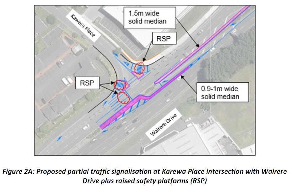 Opposing the planned raised platform on Wairere Drive at the Karewa Place turnoff