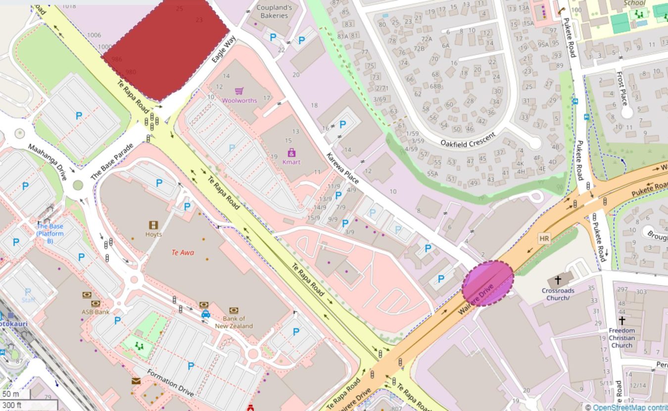 The excuse for this attack is a new Pak n Save planned for Te Rapa, near The Base. There is nothing unusual about the new supermarket that justifies the attack – in fact it is beside a Countdown and a K-Mart. Yet the council is forcing Pak n Save to pay for building a new lights-controlled intersection at Karewa Place, over half a kilometre from the Pak n Save site.  Karewa Place already has a simple and functional left-turn-only slip lane to Wairere Drive that does not disrupt traffic. Lights at the nearby crossing with Te Rapa Road means there are frequent breaks in the traffic to allow good flow from the Karewa connection. It works. There is no need to touch it.